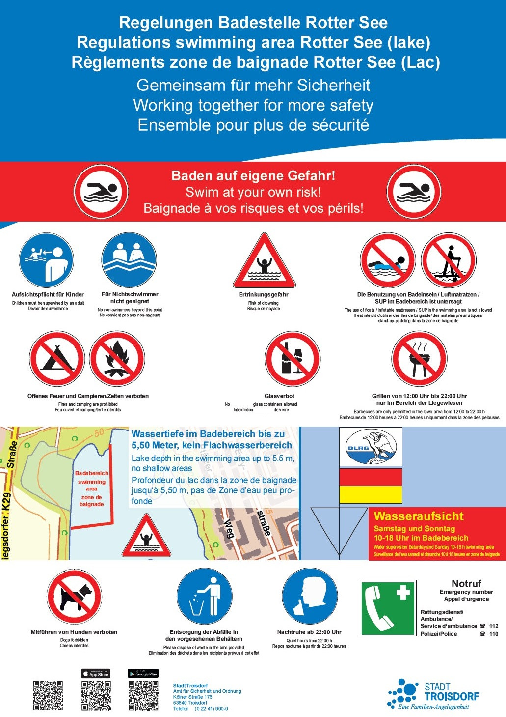 Der Rotter See in Troisdorf ist einer der wenigen und somit auch einer der beliebtesten Badegewässer in der Region Bonn/Rhein-Sieg. An den sommerlichen Tagen des Jahres tummeln sich hier hunderte Badegäste vor allem am Badestrand.